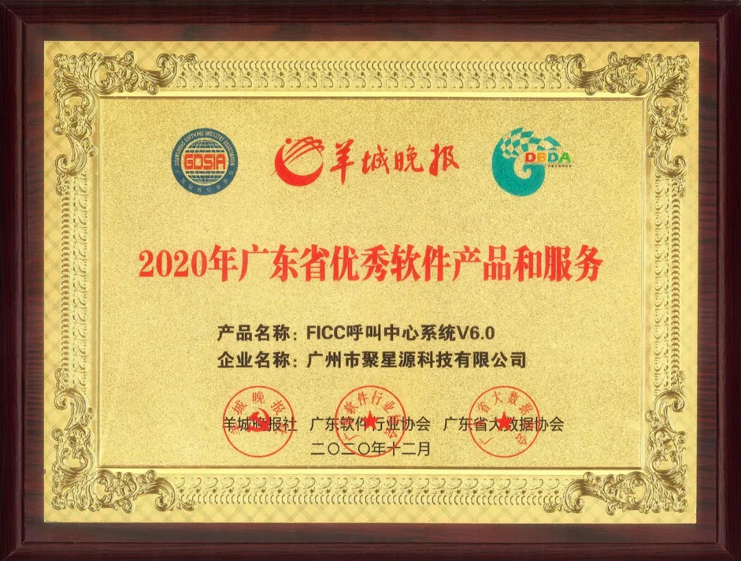 聚星源科技應邀出席,其旗艦產品FICC呼叫中心系統V6.0榮獲“2020年廣東省優秀軟件產品”獎項。