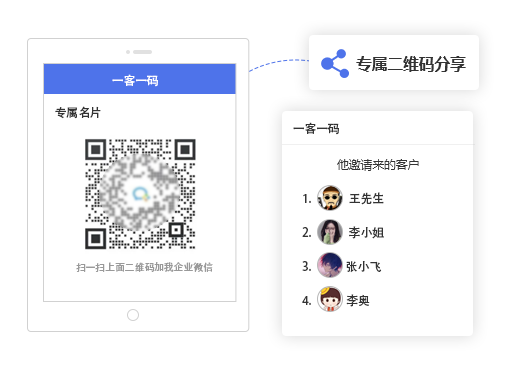 一客一碼:客戶掃碼添加坐席企業微信號,顯示不同渠道來源,幫助企業分析渠道質量。